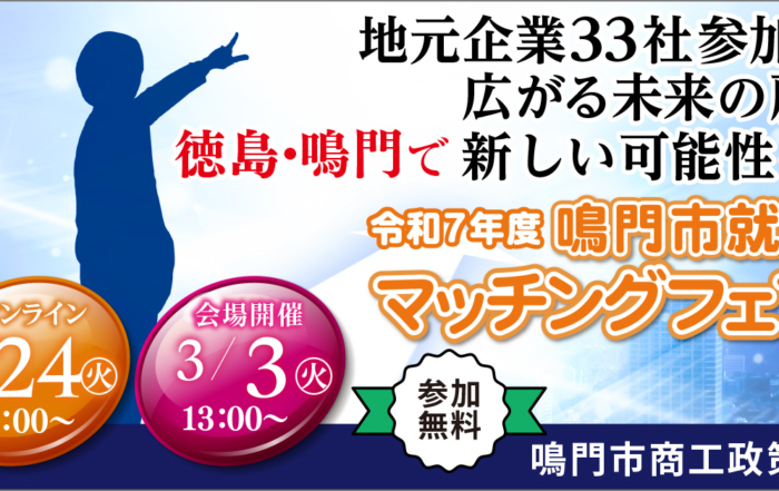 徳島県 鳴門市2026-02-06T08:50:00+09:00【学生・転職希望者、大歓迎!】『令和7年度鳴門市就職マッチングフェア』開催!By 徳島県 鳴門市|2026-02-06T08:50:00+09:002026.02.06|