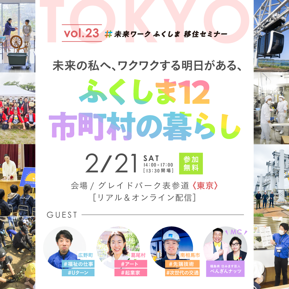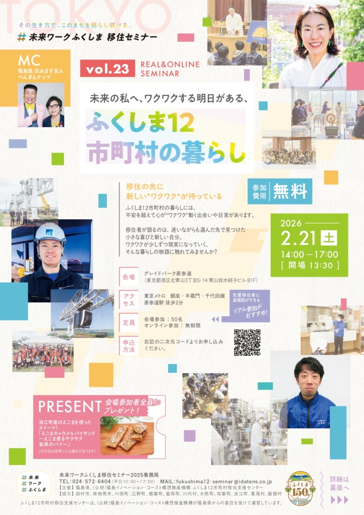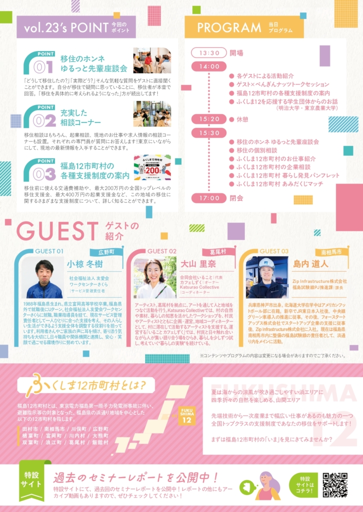 | 15:30 | ・移住のホンネ ゆるっと先輩座談会 ・個別相談(移住・仕事紹介・起業) ・ふくしま12体験コンテンツラリー ・ふくしま12市町村 暮らし発見パンフレット ・ふくしま12市町村 あみだくじマッチ ・ぺんナツちょい寄りカフェ |