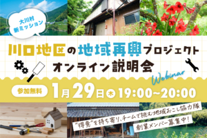 大川村の川口地区はかつて賑わいがありましたが、現在は人口減少と空き家の増加が進んでいます。この地区に新たな人の流れと生業を生み出すため、空き家を活用したゲストハウスの運営を中心としながら、地域課題(観光開発・農業サポート・住民の困りごとサポート)にも取り組む、マルチワーカー型地域おこし協力隊を募集することになりました。