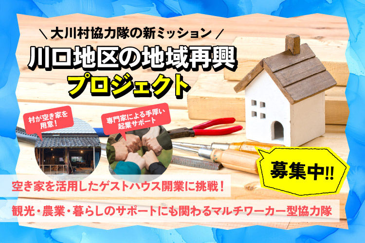 大川村の川口地区を舞台に、空き家を活用したゲストハウスの運営を中心としながら、地域課題(観光開発・農業サポート・住民の困りごとサポート)にも取り組む、マルチワーカー型地域おこし協力隊ミッションです。
