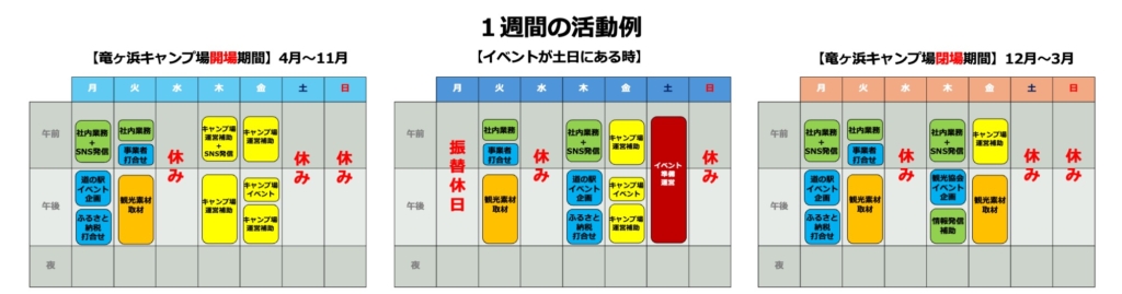 観光協会が管理しているキャンプ場や道の駅で行われるイベントのサポートを経験したのち、2年目以降は企画の見直しや新たな提案ができることを期待します。