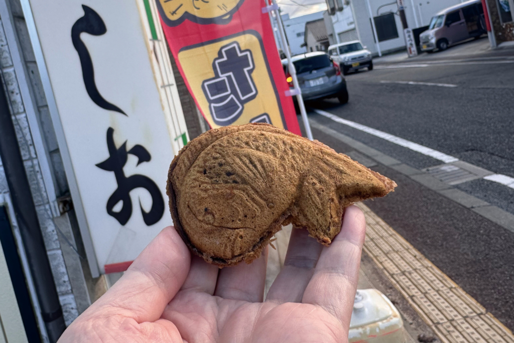 小腹が空いたときにうれしいスイーツのお店もあります。菓子処しおは、現在の店主・塩丈浩さんで3代目となる老舗の和菓子店。名物は、店先で一匹ずつていねいに手焼きする「天然もの」と呼ばれるたい焼きです。黒糖の風味豊かな薄皮の生地のなかにこしあんが入っています。地元の人々に長く愛されるご当地おやつです。