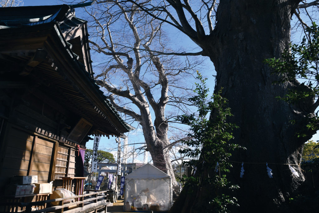 見どころは、サイクリングロードから200mほど東に入ったところにある鹿島御子神社(かしまみこじんじゃ)。境内には樹齢900年とも1200年とも伝えられる大ケヤキが2本あり、別名「夫婦ケヤキ」とも呼ばれ、見る人を圧倒します。