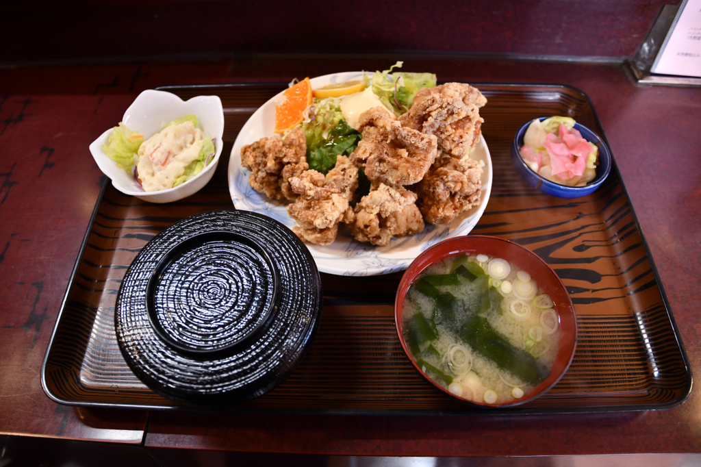 そんな亀八の人気メニューは、唐揚げ定食。からっと揚げられた大きな鶏胸肉の唐揚げが7つも乗った大満足の一品です。