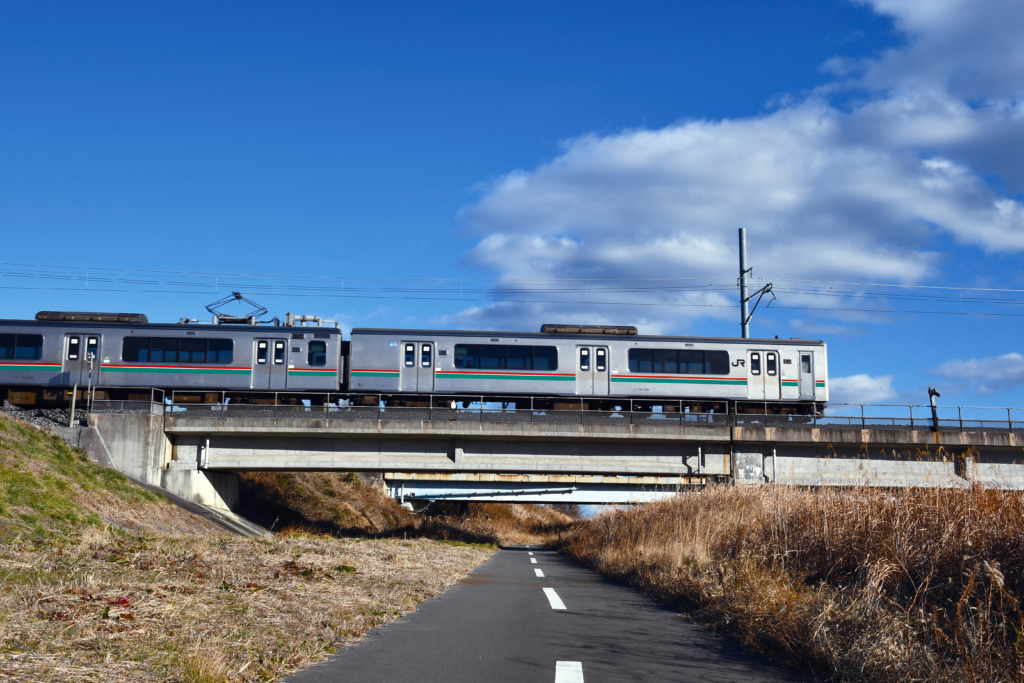 専用道路をしばらく進むと、JR常磐線の橋が見えてきます。タイミングがよければ、サイクリングの合間に、走り抜ける電車を眺めるひとときが楽しめます。
