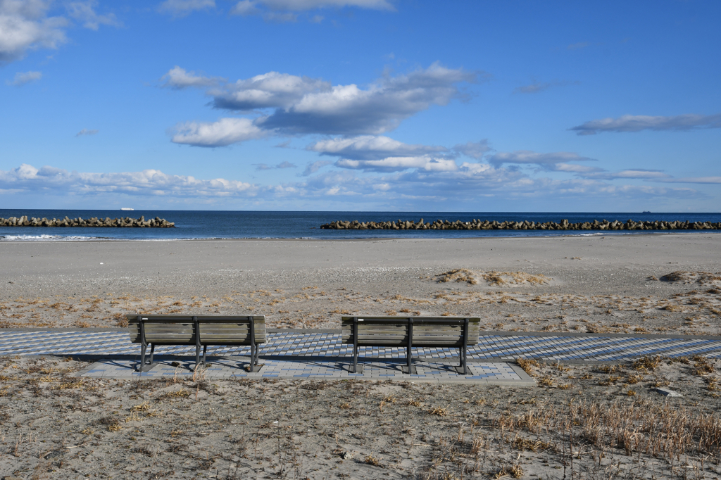 漁港を過ぎ、最後に防波堤の坂を上ると、視界が一気に開け、目の前に太平洋が広がります。ここがゴール地点の烏崎海浜公園です。ベンチや東屋、トイレなどが整備されています。相馬野馬追の開催が近づくと、早朝にここで乗馬の練習をする風景がよく見られるそうです。