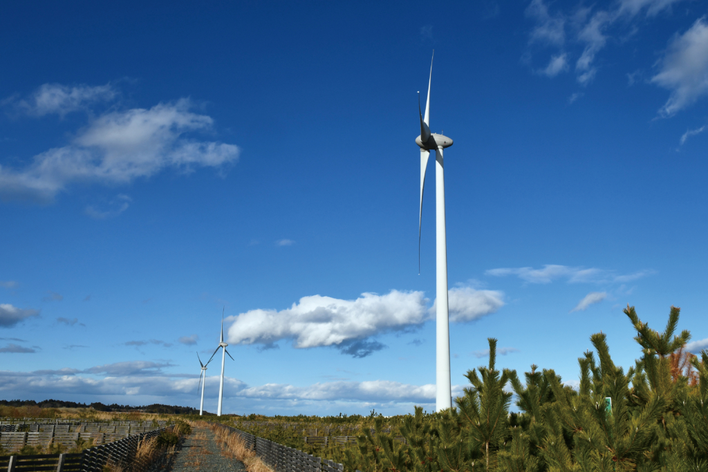 JR常磐線と並行する国道6号線の橋を越えると、周囲には再び田園風景が広がり始めます。堤防上の道を東へ進みゴールを目指すと徐々に大きく見えてくるのが、4基の風力発電用の風車(万葉の里風力発電所)。南相馬市の新しいシンボルのひとつとなっています。