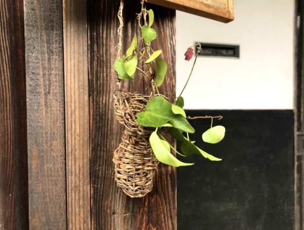 ①庭にある細いツル草を使った一輪挿しと小物入れ