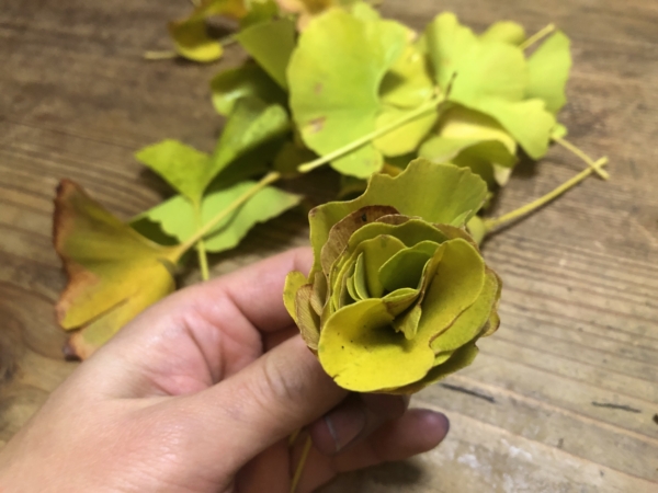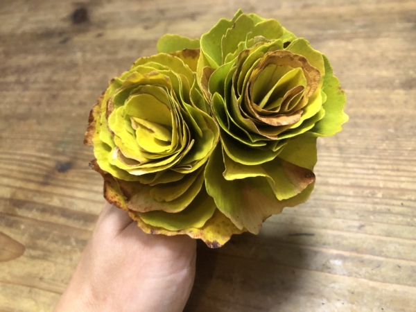イチョウの葉でも、簡単にとても素敵なお花を作ることができます。今年は、まだそれほど葉が落ちていなかったので、少しだけ拾ってきた落ち葉でお花を作ってみました。