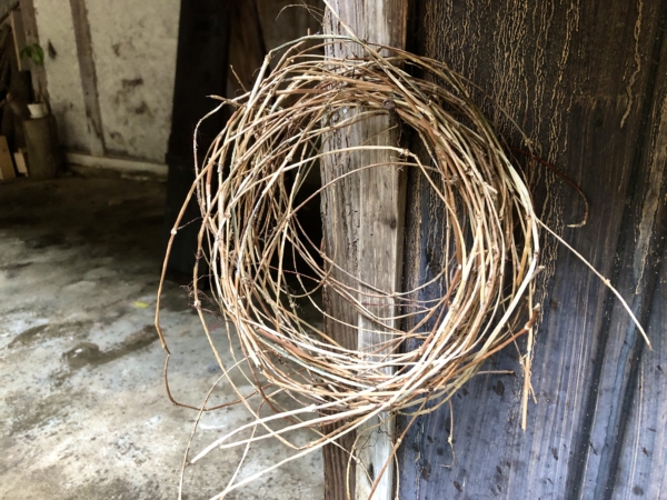 夏になると、庭には名前の分からないツル草が数種類、すごい勢いで茂りはじめます。放っておいても秋の終わり頃には枯れていくのですが、今年は枯れる前にズルズルと引っ張ってツルを収穫し、葉っぱを落として干しておきました。長いものでは2mくらいになります。