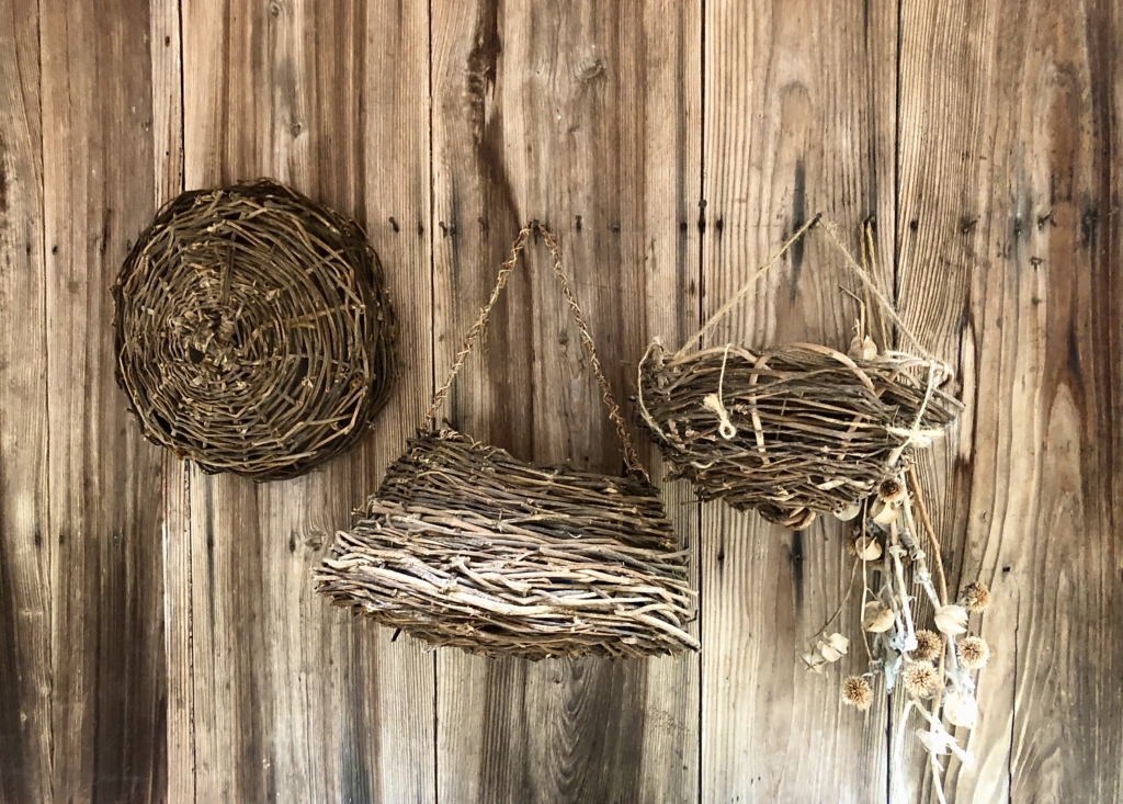 材料はクズの茎。左から、浅カゴ、手提げカゴ、深ザル。