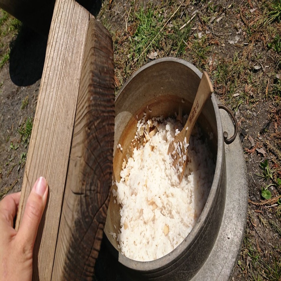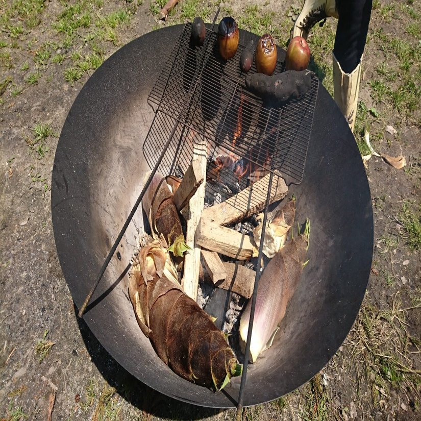 立派な釜でタケノコご飯を炊き、具だくさんなお味噌汁を作り、炭火でタケノコを皮ごと焼いたり、リンゴやさつまいもも焼きました!