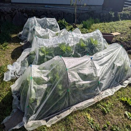 そこで私は、家庭菜園のエキスパートであるご近所さんたちに勧められて、楕円形の支柱と不織布も買った。これでトンネルを作って畝を覆い、虫から物理的に野菜を守るのだ。