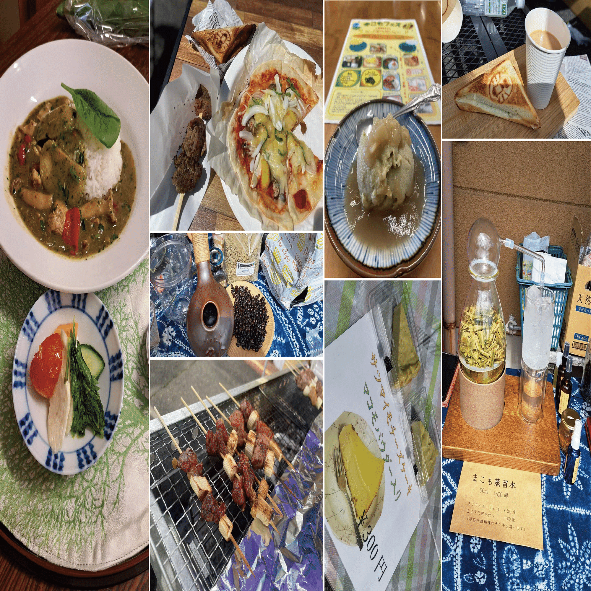 まこもフェスの料理(まこも入りグリーンカレー、まこもピザ、まこも炭入り自家焙煎コーヒー、まこもとジビエの串焼き、溶けないまこもアイス、まこも入りチーズケーキ、まこもが入ったホットサンド、まこもの蒸留水)