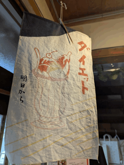 月あかりカフェの会計カウンターの上にぶら下がる暖簾 人がデザートも食べようかどうしようか悩んでいる時に、この暖簾はズルい(笑)