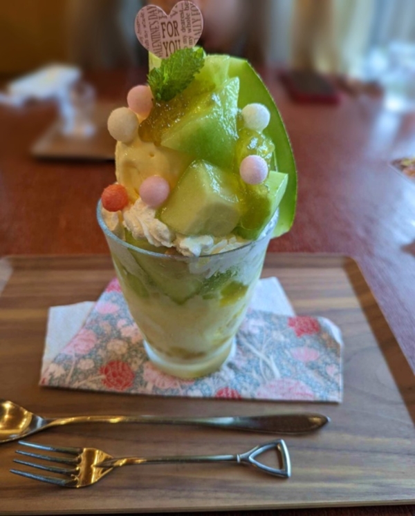 メロンたっぷりのパフェ。メロンとクリームのマリアージュが最高でした。