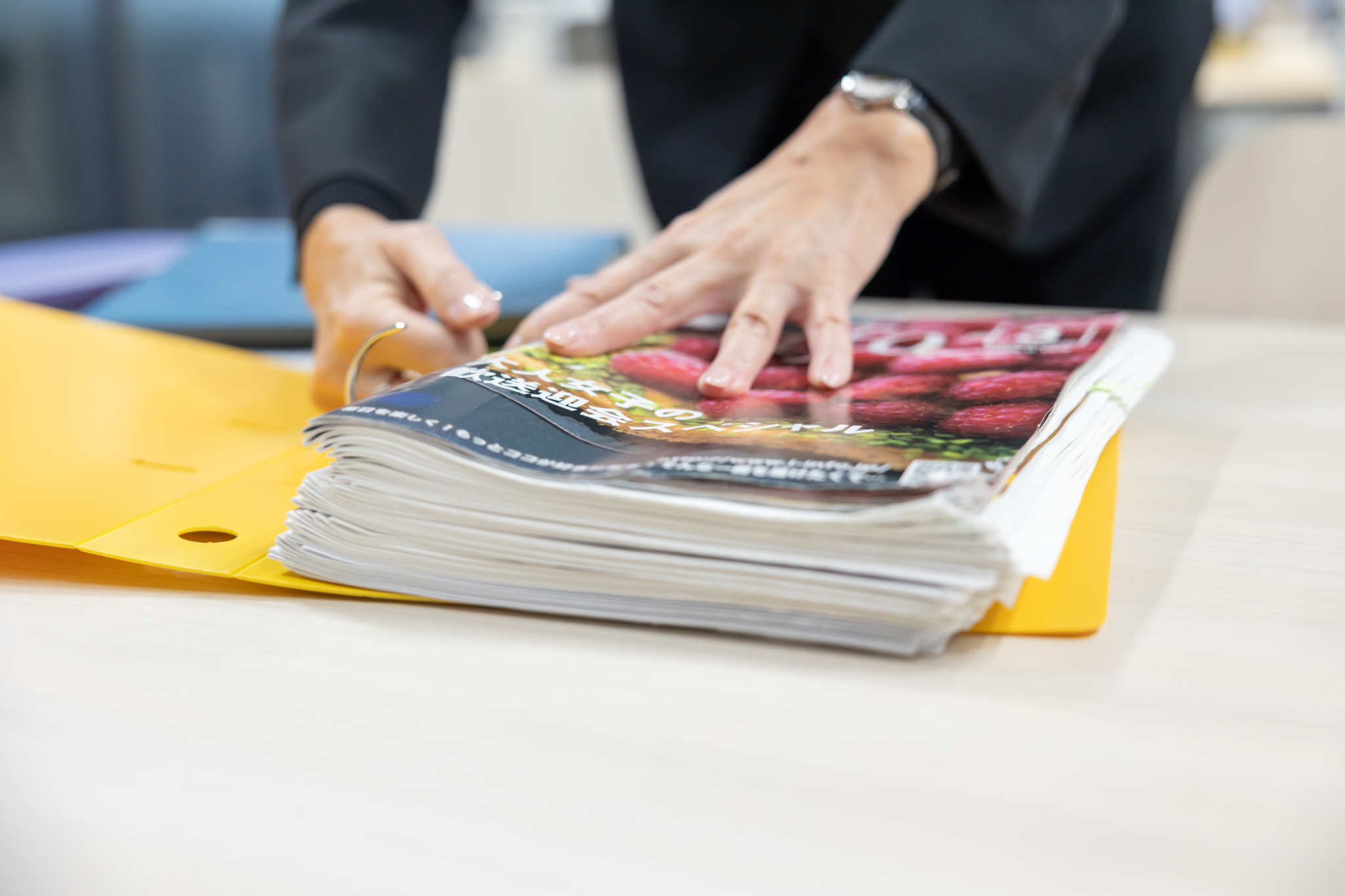 そんな中、2011年に東日本大震災が発生しました。原発事故により、野口さんは町外への避難を余儀なくされましたが、郡山市にアパートを借りて編集を続け、震災から3か月後に発行を再開しました。また、町内の事務所には創刊以来の貴重な誌面データが残っていましたが、立ち入りができたときにタイベックススーツを着て、ドライバーを1本持って事務所に入り、パソコンからハードディスクだけを取り外し、貴重なデータを持ち帰りました。当時の号はファイルに閉じこまれており、多くの飲食店やフリーペーパーに写る若者たちの姿から、震災前の双葉郡の賑わいが伝わってきます。