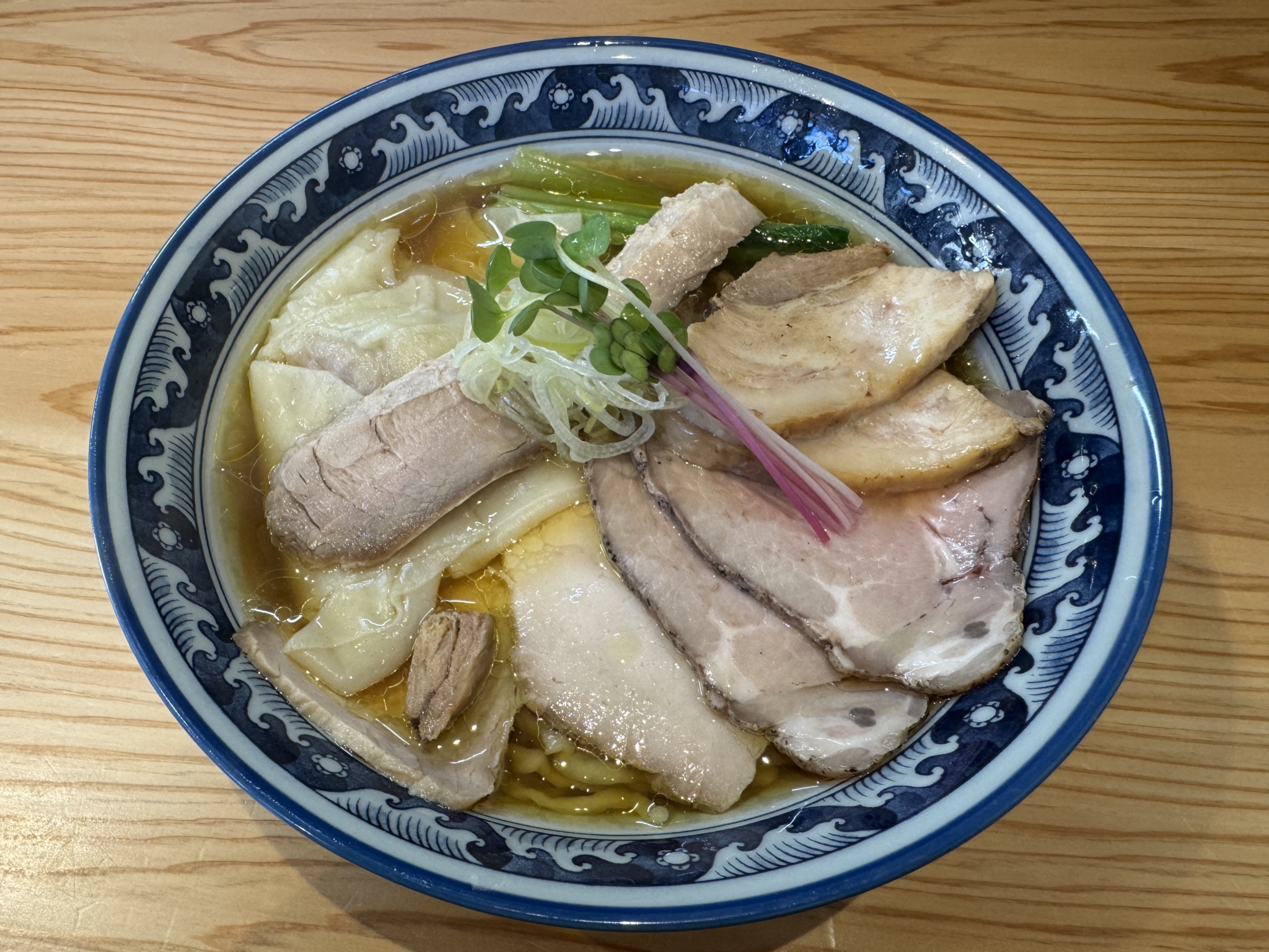 ワンタンチャーシュー麺(醤油)。ワンタンはちゅるちゅるとした滑らかな食感