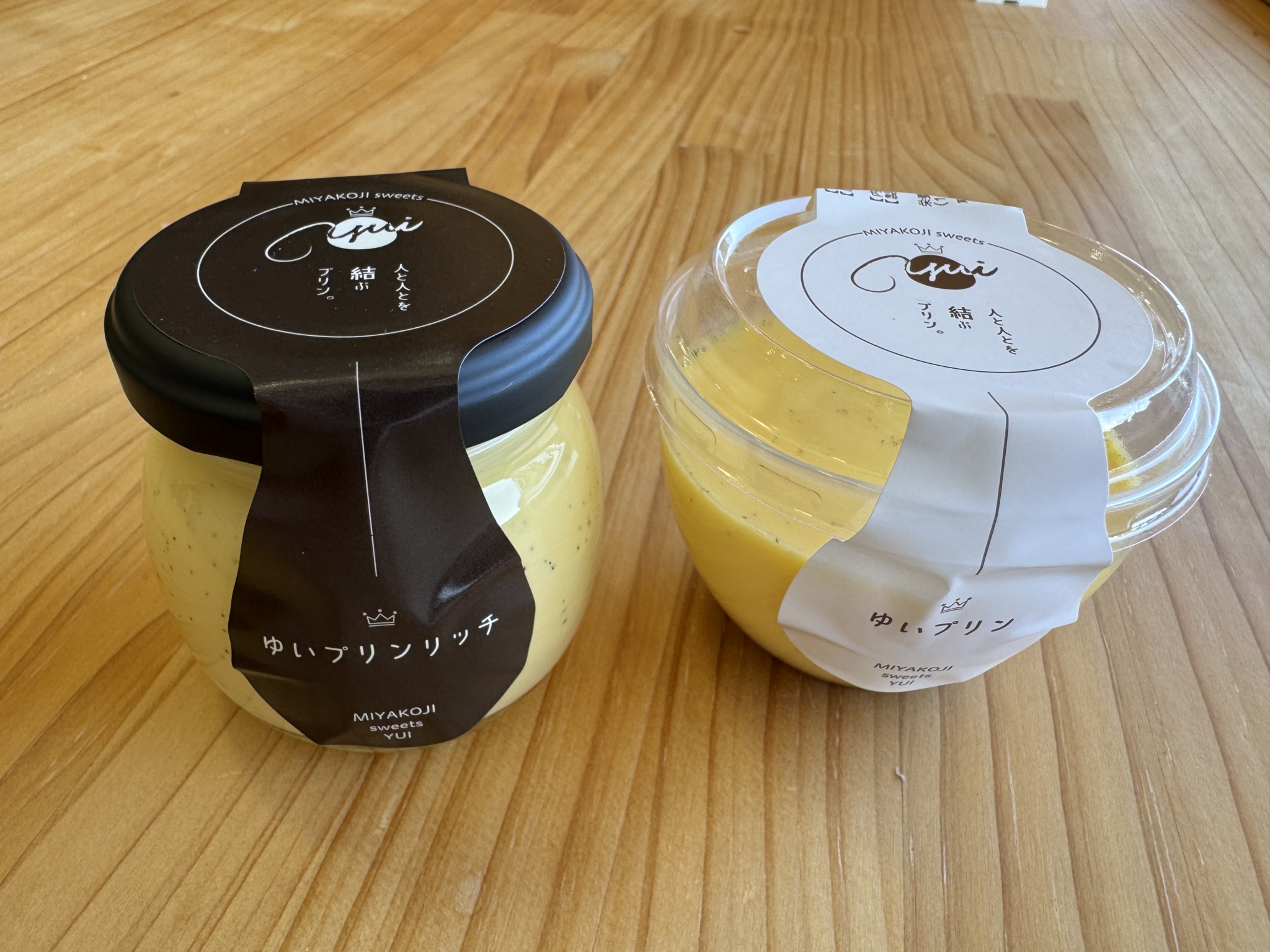 ゆいプリンリッチ(左)と、ゆいプリン(右)。ゆいプリンリッチは別添のカラメルソースをかけていただく