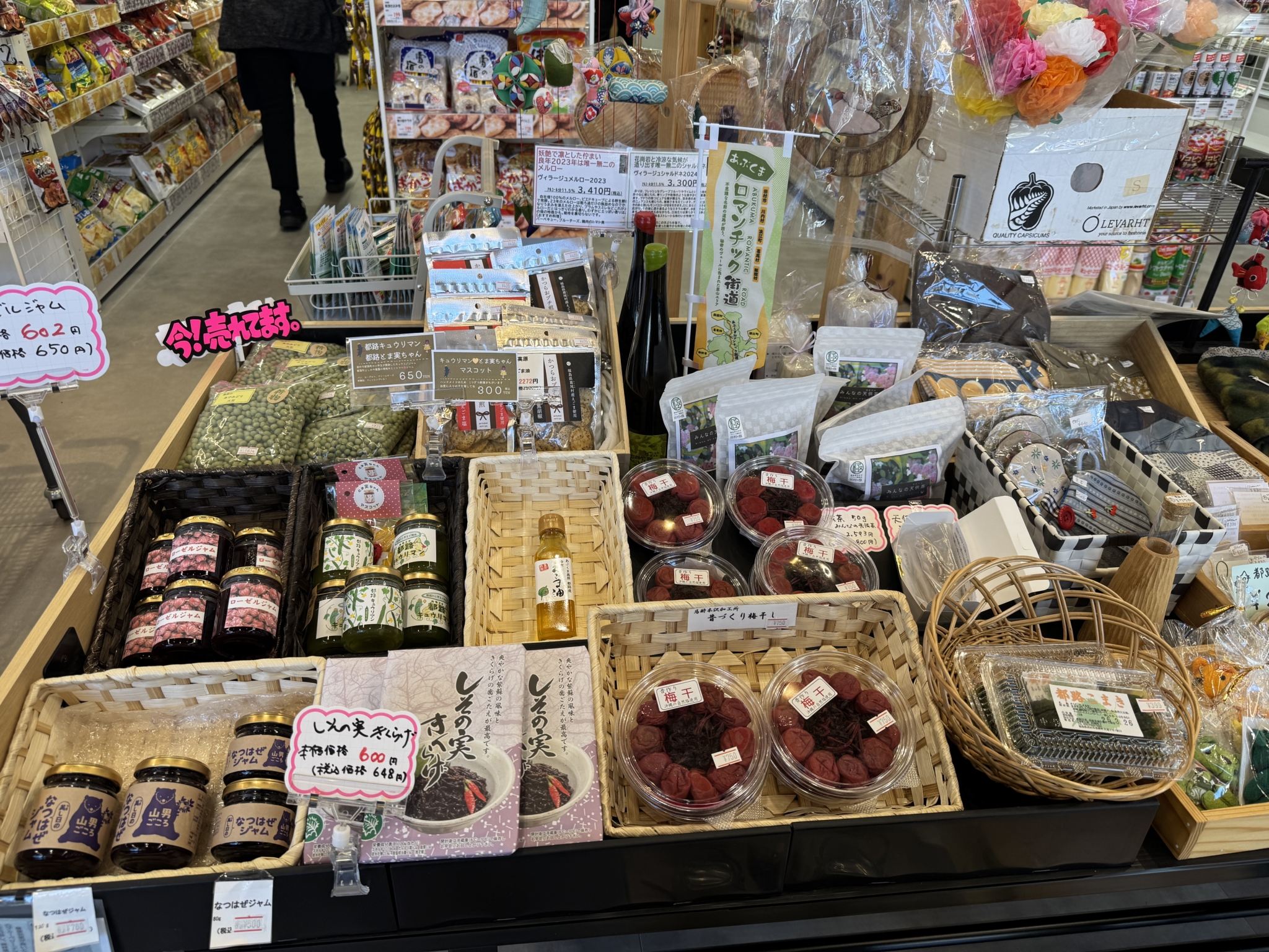 ほかにも、都路町産のお米のみを使った日本酒「みやこじの里」や、ハム工房都路のハムやウインナー、渡辺豆腐店の「都路手造り豆腐」や「油揚げ」、都路小学校の児童が開発したきゅうりジャム「都路キュウリマン」、地元の人が作った梅干しや漬物などの加工品、地場野菜、手作り品などが、所狭しと並んでいます。おいしいものから実用的なものまで、都路町の魅力を存分に楽しむことができます。
