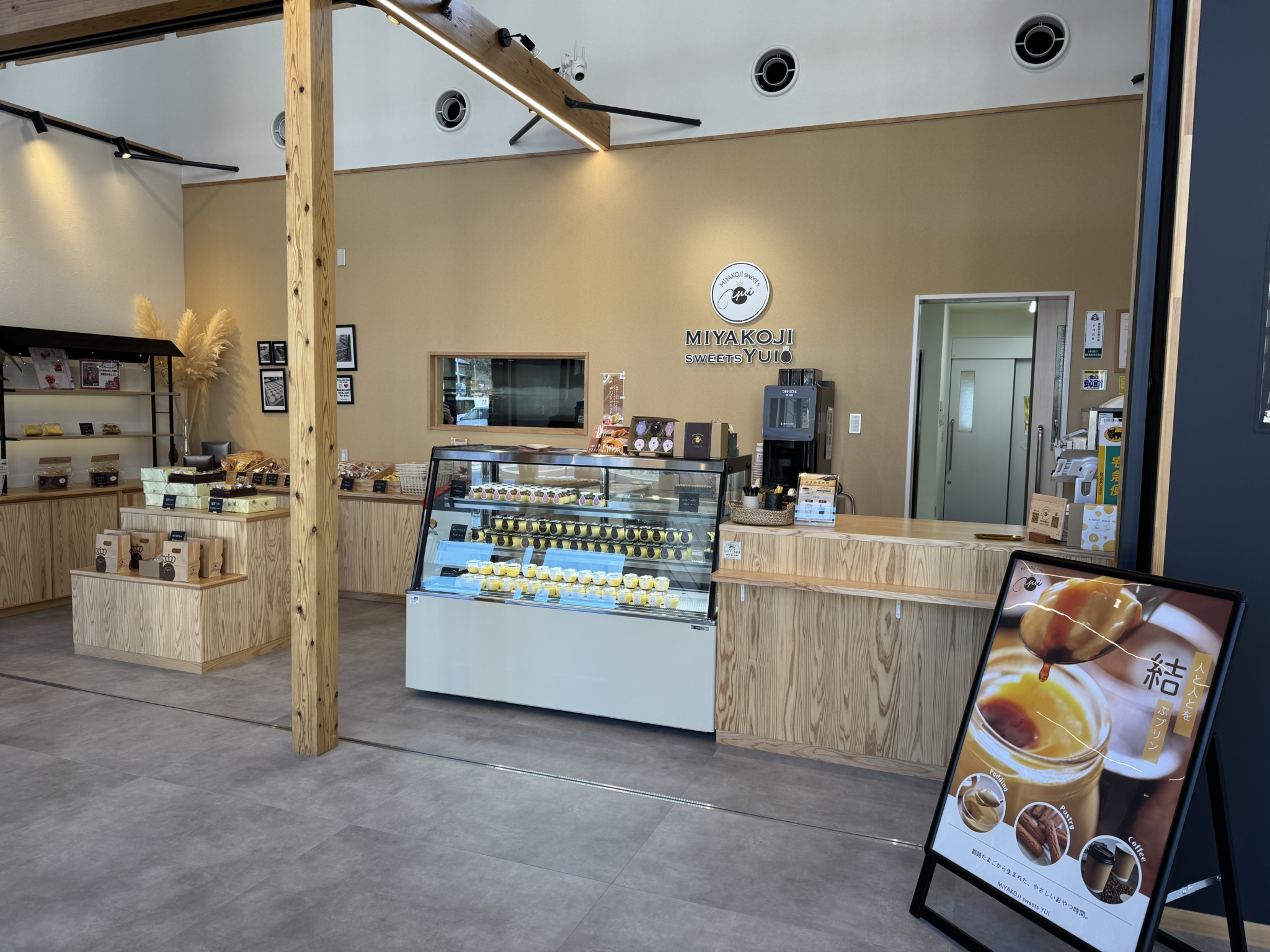 Domo岩井沢店の隣には、同じく移転オープンした「みやこじスイーツゆい」が並びます。テイクアウトコーヒーと一緒に、おなじみのゆいプリンや焼き菓子を楽しむことができます。
