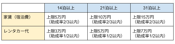 将来的に地方移住や二地域居住等を考える子育て世代の家族が、市内の賃貸住宅(宿泊施設)に地方テレワーク・ワーケーションで2週間以上滞在した場合、以下の費用の一部を助成します。