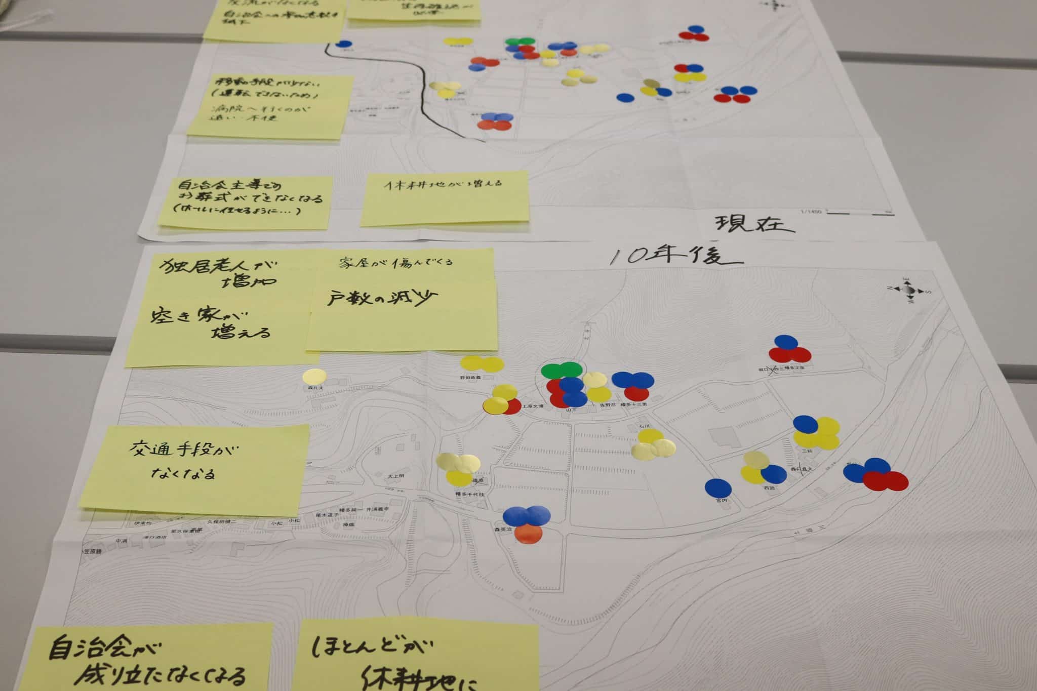 2019年夏に行われたワークショップでは、地域の現状を把握するため、簡易版集落点検を実施。まずは集落ごとに分かれ、学生がファシリテーターとなり、地図に草刈りなどの共同作業を行う、地域の担い手となっている世代(18歳~74歳)の男性を青、女性を赤、18歳未満の子供は緑、75歳以上は黄色のシールを貼り、現在の集落の人口構成を把握します。