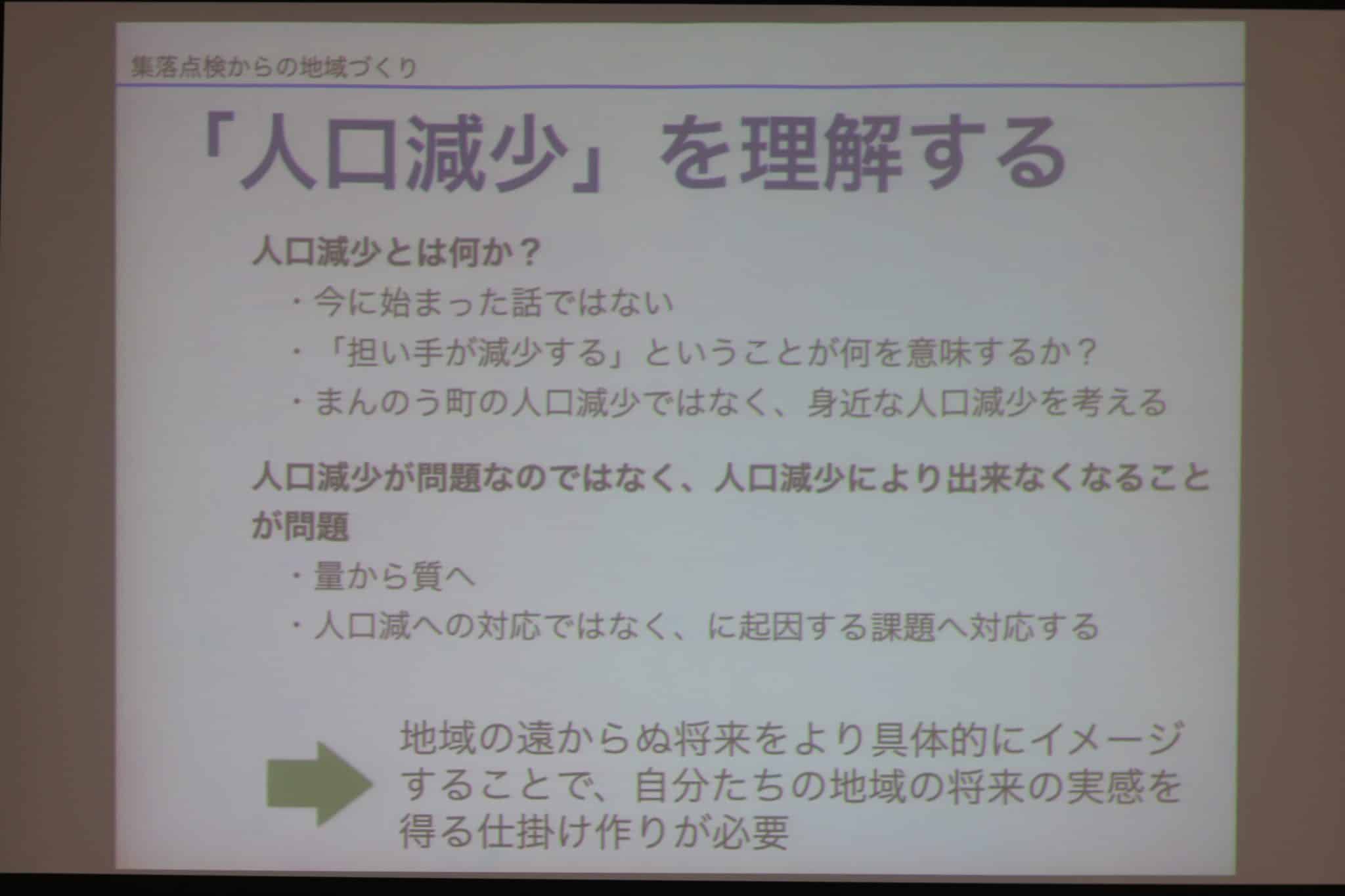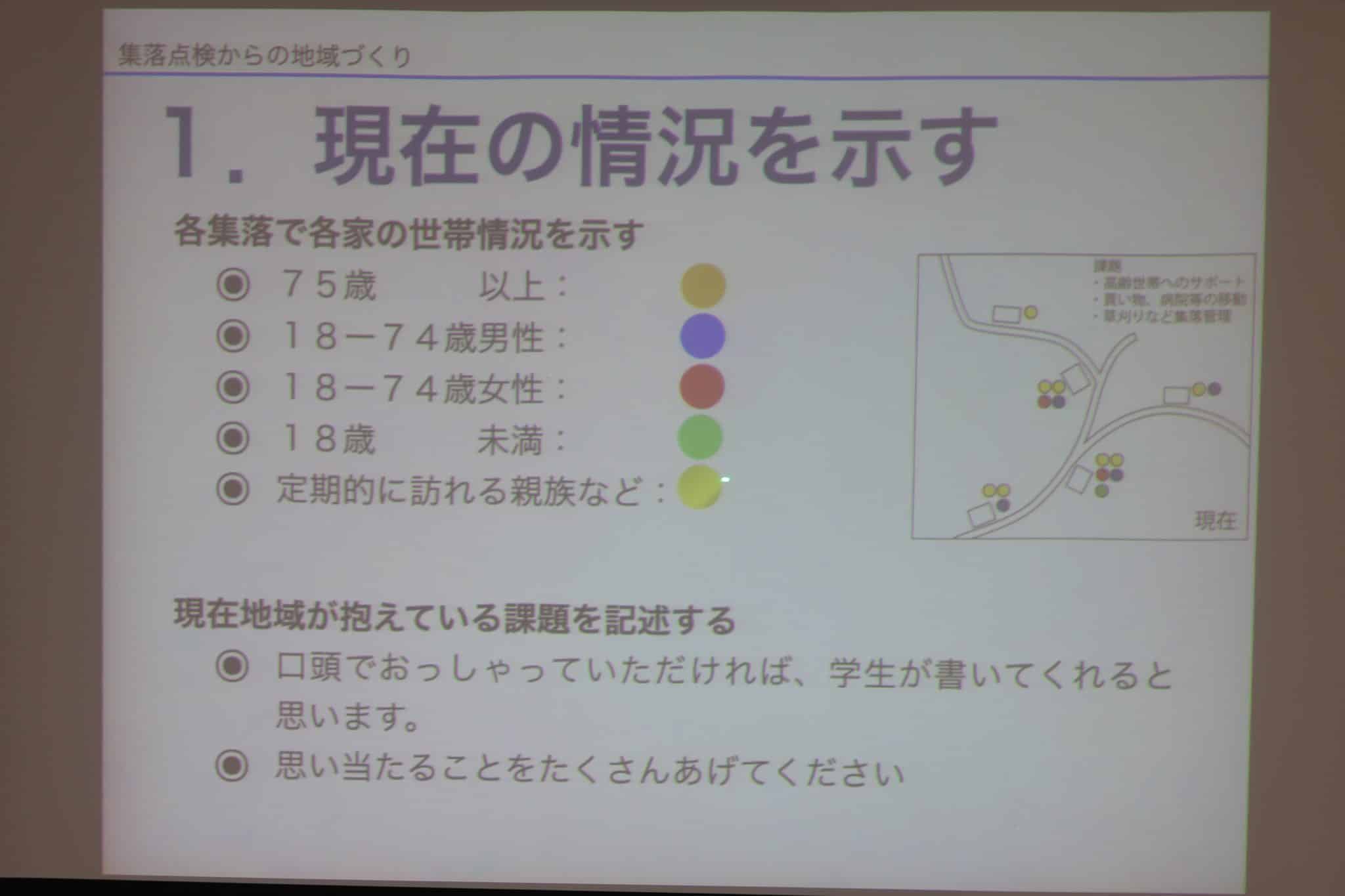 WSは連続3回。3週間おきに行われる2回目、3回目のWSでは課題に対してどのような手を打っていくか、その課題に誰が取り組み、何から始めるべきかを話し合っていきます。「地域づくりは『新たな特産品を開発しよう!』ということだけではない。より現実的なことに取り組んで、取り組みのリズムが出来たら少しずつ難しいテーマにも挑戦していく。ひとつでも行動に移すことで人口減少への対応が進んでいくと思います」と話す田口先生。