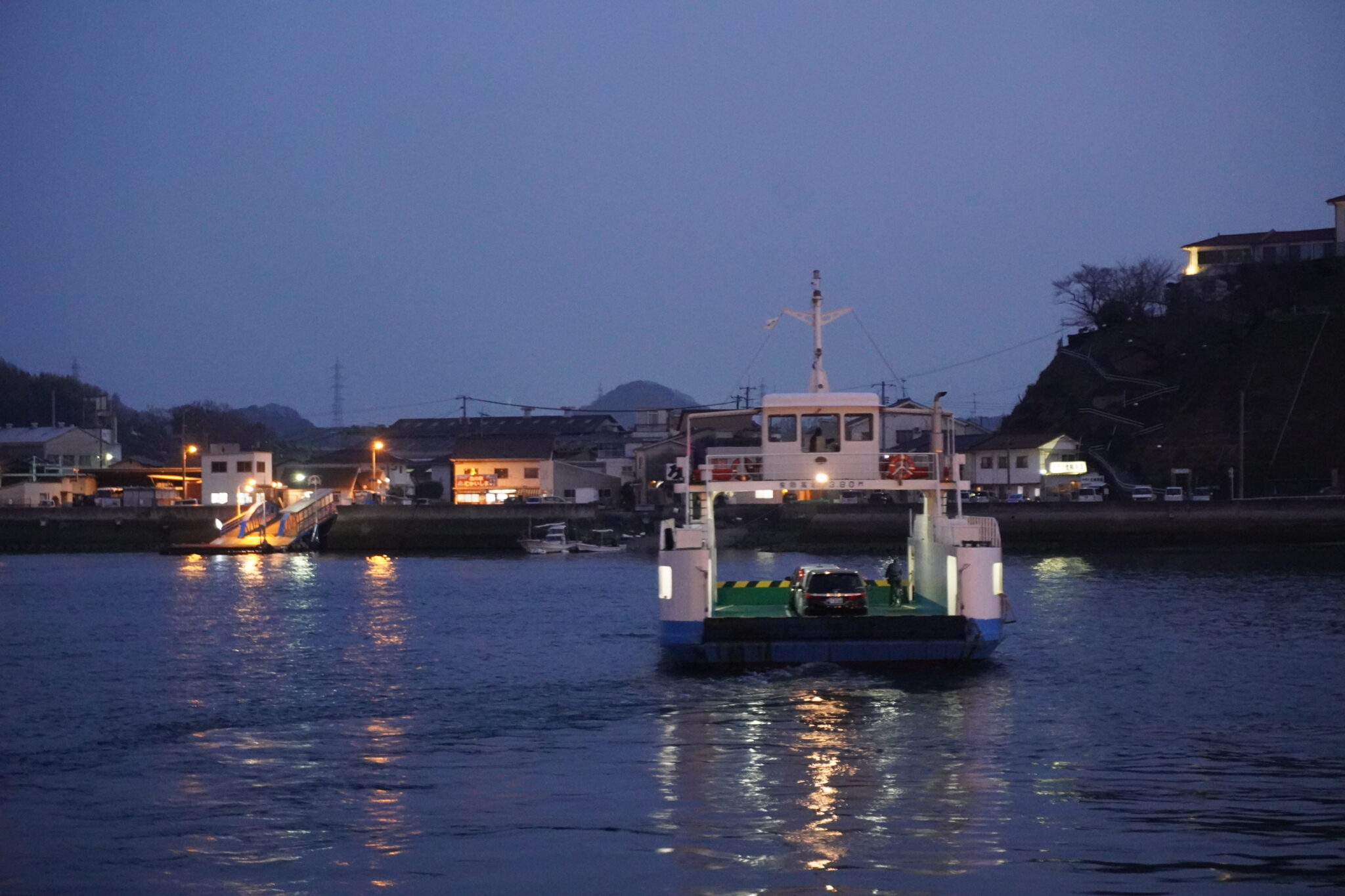 夜も更けると、向島へ戻る会社員や学生が、自転車、車、徒歩など、それぞれの帰路道を渡船に委ねます。今回、3本の航路の中から尾道渡船を使用。徒歩であれば、片道ワンコイン100円の運賃です。