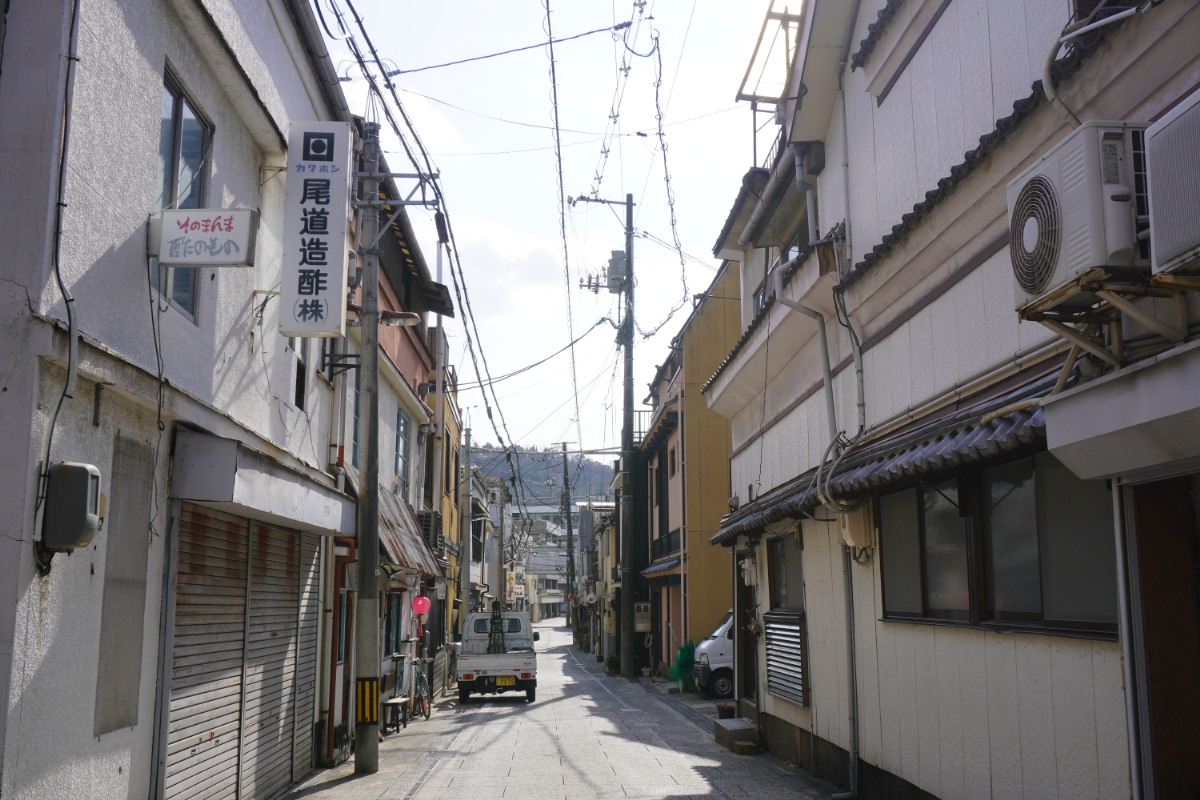 ここは水尾町通り。尾道市役所付近から商店街に向けて南北にのびる道です。