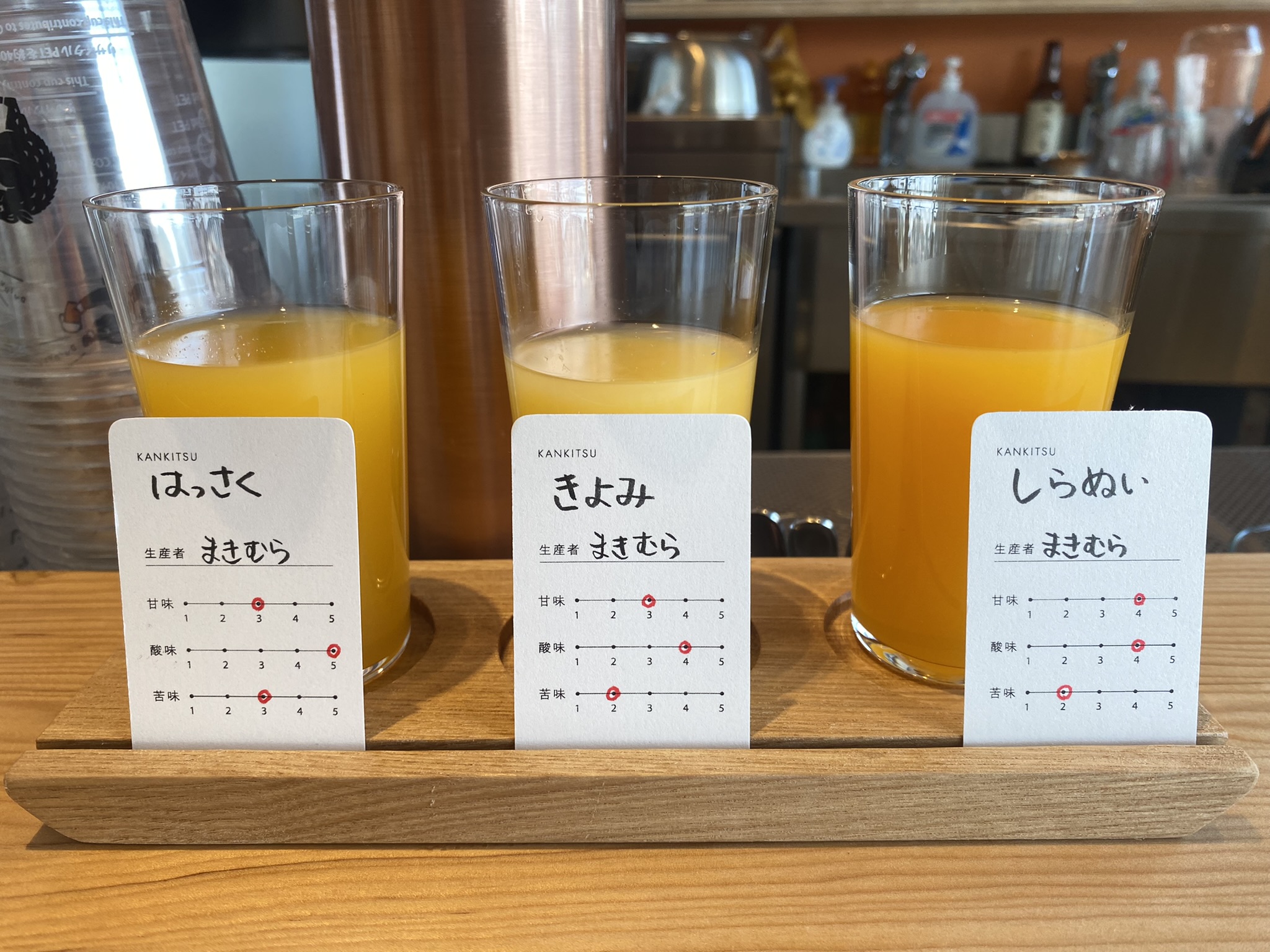 こちらは尾道駅に出来たばかりの柑橘ジュースバー。しまなみ海道で収穫される柑橘類を常時数種類取り揃えており、搾りたてのフレッシュジュースをいただけます。お店のおススメは3種類の柑橘ジュースを飲み比べできるセット。