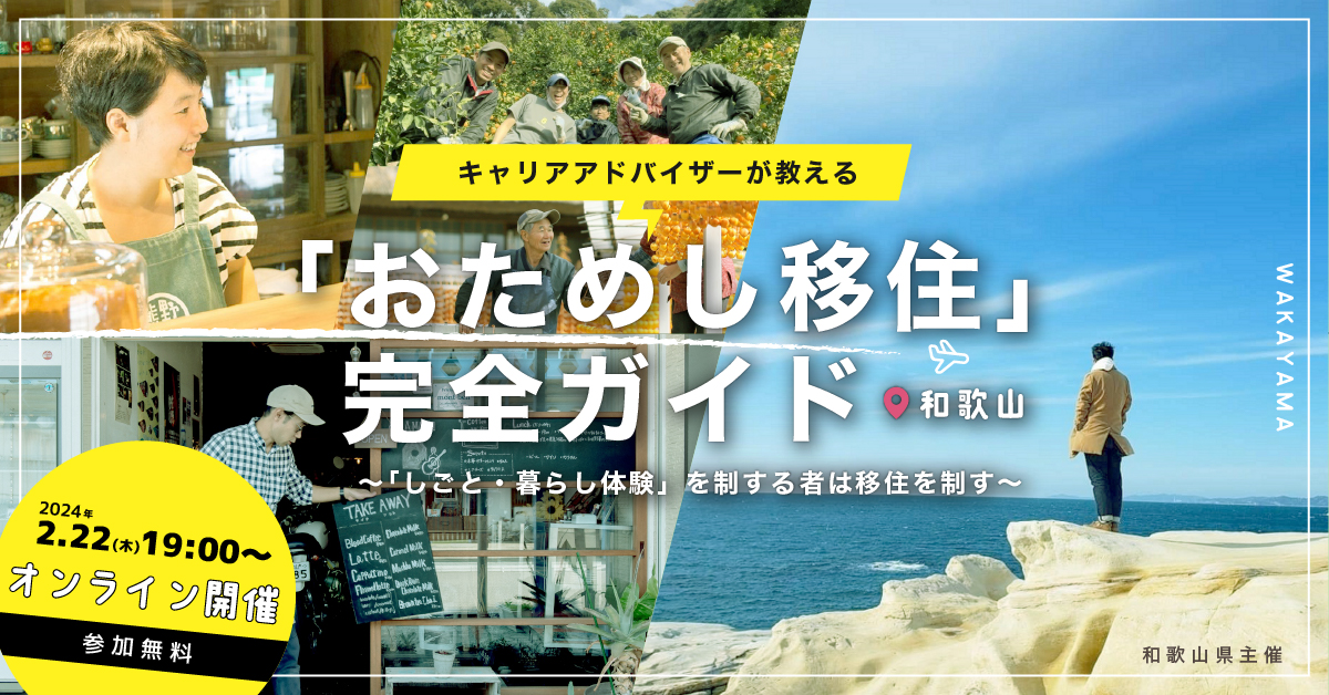 このイベントでは、多くの移住希望者をサポートしてきた和歌山県の移住&キャリアアドバイザーが、「お試し移住」の活用ポイントや裏話、自分にあった「お試し移住」の見つけ方などをお伝えします。