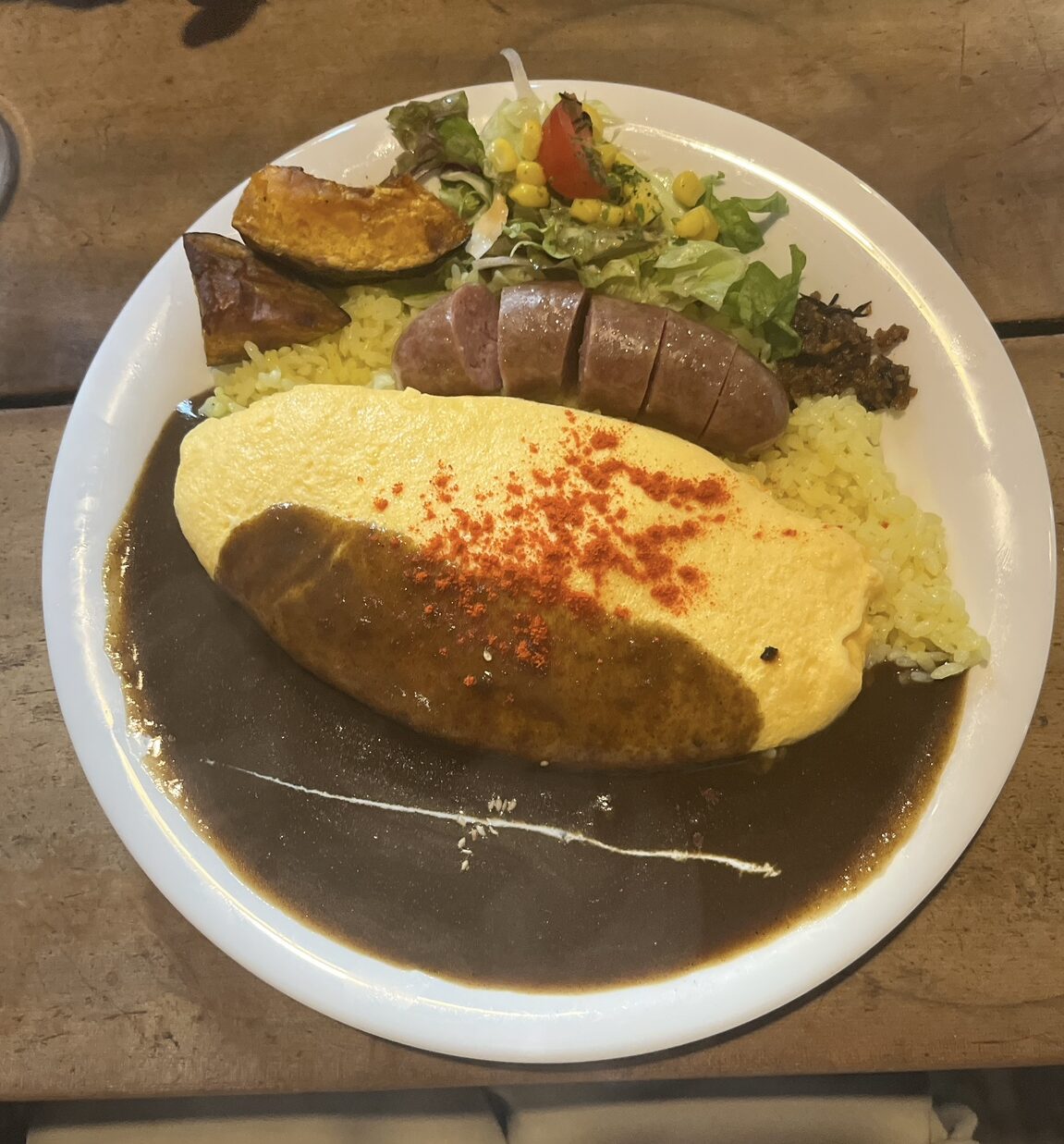 こちらのオムカレーは、地元産の食材を活かした優しい味わいが特徴です。