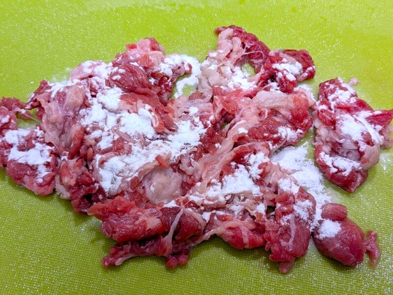 牛肉はあらかじめ塩こうじを揉みこみ、少し時間をおいたところで片栗粉をまぶしておきます。