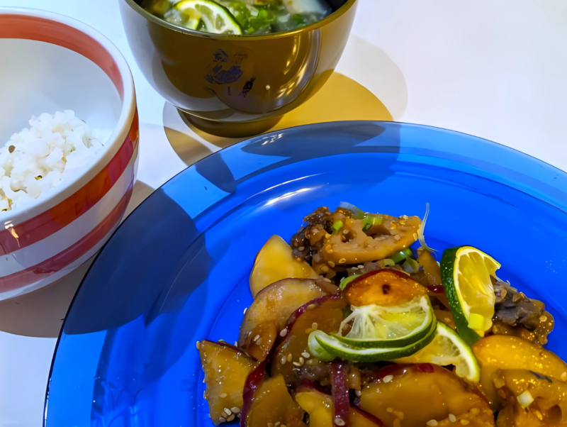 最後に、味のアクセントにすだちの薄切りを乗せて「なると金時と徳島産れんこんと牛肉の甘辛炒め煮」の完成です!