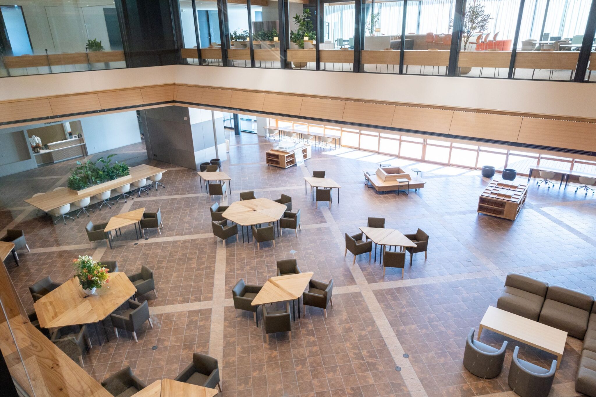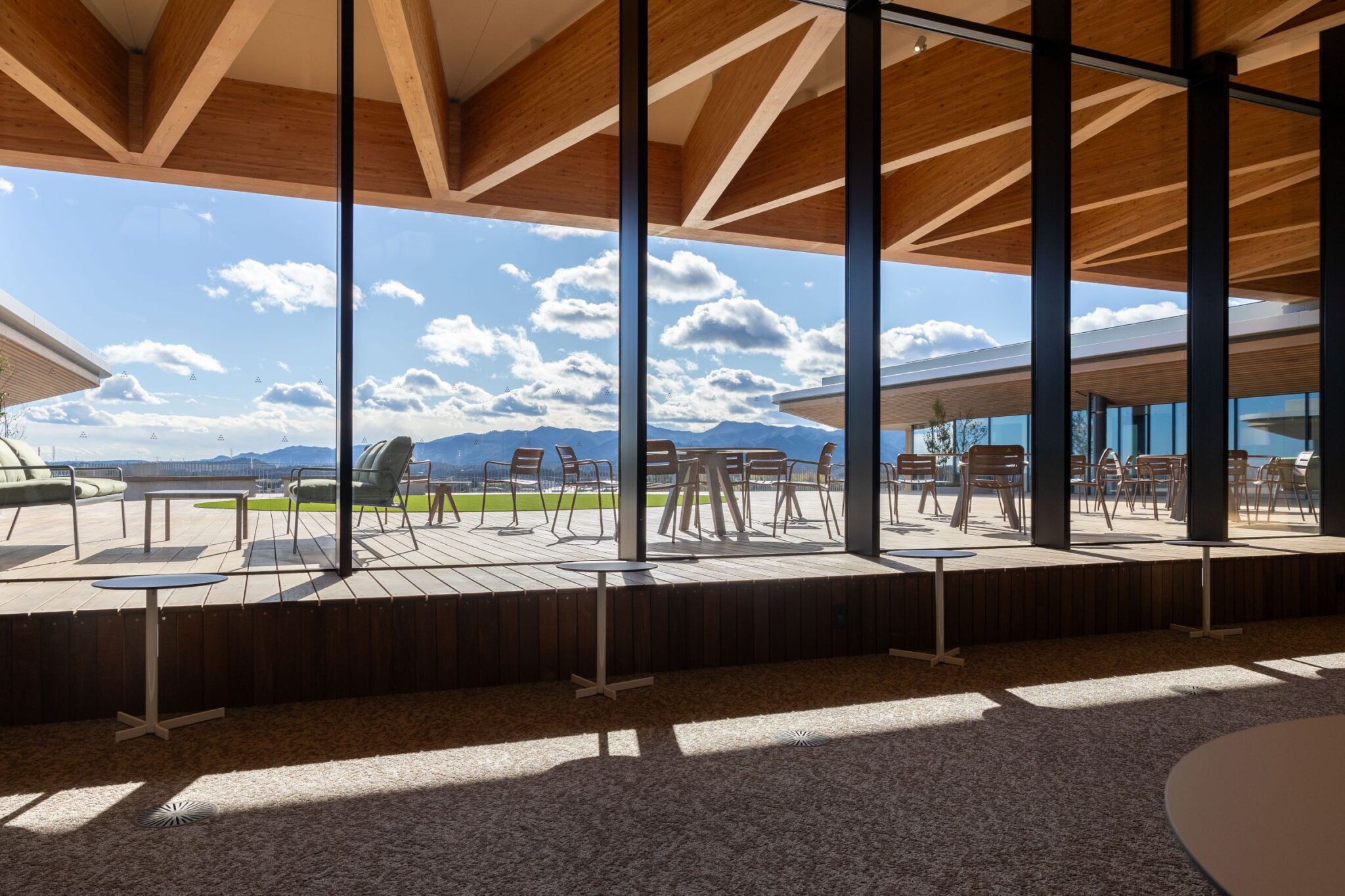 また、3階の窓側にもオープンスペースがあり、外のバルコニーには机、椅子やソファが置かれています。バルコニーからはクマSUNテラスの芝生広場や大野駅、そして阿武隈高地の山並みを一望することができます。