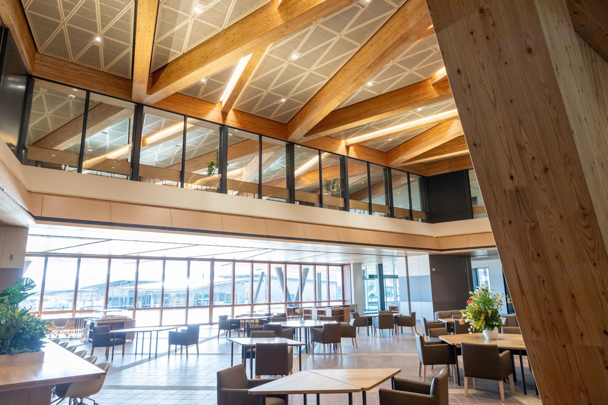 「CREVAおおくま」は地上3階建て。建物の内外には県産の木材が多く利用されており、温かみのある木の空間が特徴的です。また、屋上には太陽光パネルを設置するなど、全体的に環境に配慮した作りとなっています。