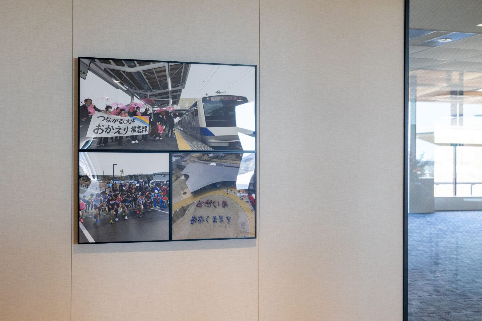 また、「CREVAおおくま」の中には、震災前・震災後の大熊町で撮影された写真が飾られています。特産の梨の選果場で笑顔を見せる子どもたち、駅前の商店街の様子。2019年、町に帰還が始まった時、町民たちで作った人文字「ただいまおおくままち」。2020年の常磐線全線開通を大野駅で祝う「おかえり常磐線」の垂れ幕……。写真に映る大熊の人の姿からは、町の歴史と復興の歩みを実感します。