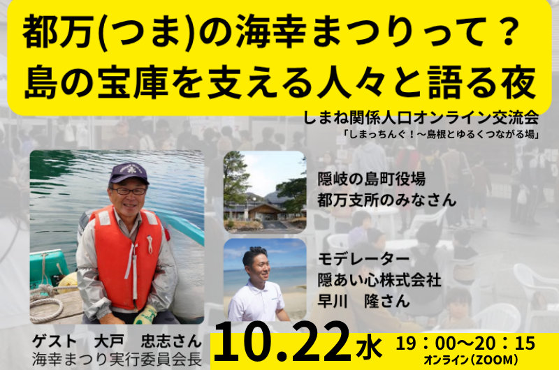 今年度第2回目の開催となる今回は、今回は、ゲストに島根県隠岐の島町・都万(つま)地区の「海幸まつり実行委員会 会長 大戸 忠志さん」と「隠岐の島町役場都万支所のみなさん」にご登壇いただきます!