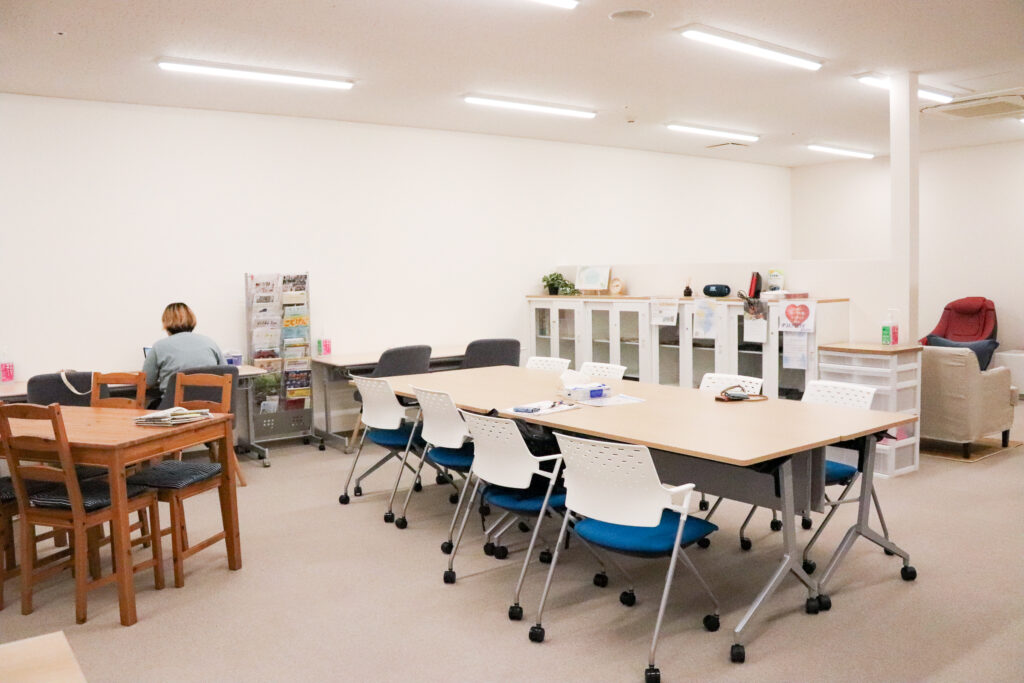 室内には、広々としたコミュニティスペースのほか、コワーキングスペース、オンライン会議や授乳に使える個室、キッズスペース、リラックスできるマッサージ機まで。現在、これらをすべて無料で利用でき、交流の場として気軽に訪れることができます。女性であれば富岡町外の方でも利用可能です。