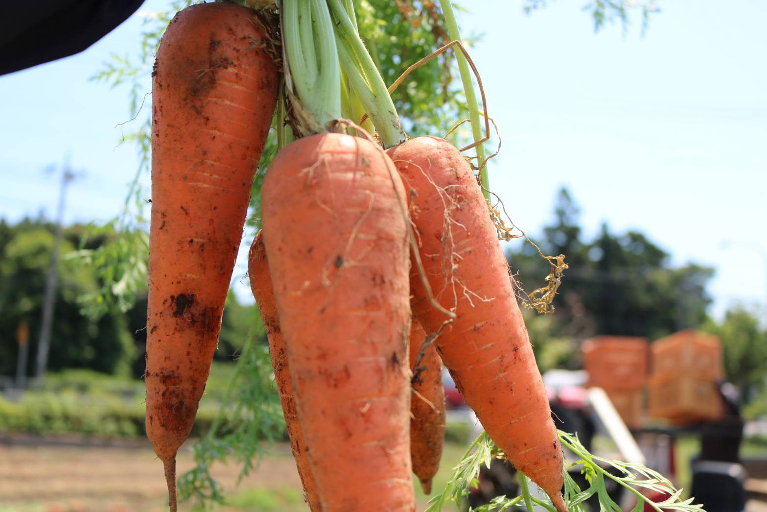 体験では、葉付きの人参をそのまま手に取り、選び方を学べます。畑の空気の中で触れる人参は、スーパーの棚で見かけるものとはまったく違った姿をしています。
