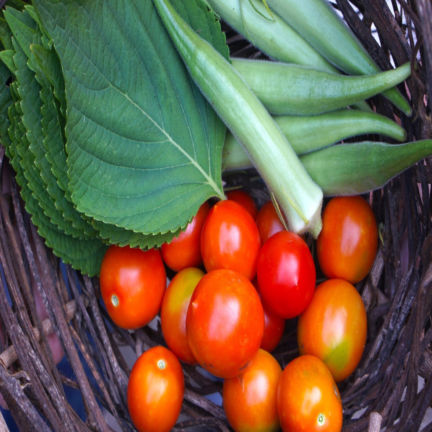 この日の収穫物は、トマトとオクラとエゴマの葉。