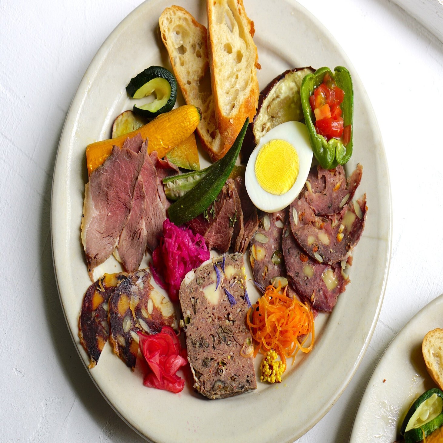 フレル食堂、コース料理の一皿。鹿肉と猪肉のシャルキュトリ盛り合わせ。