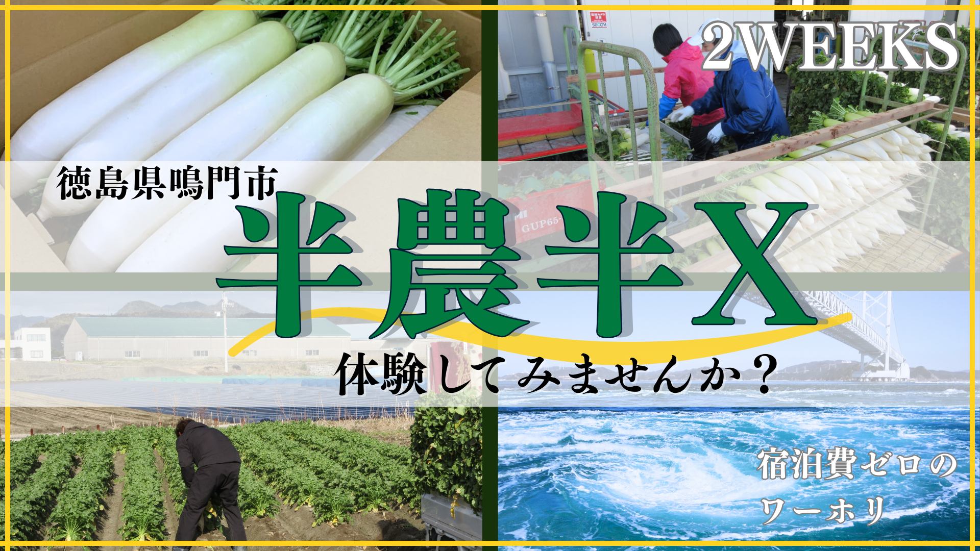世界最大級の渦潮が有名な四国の玄関口「徳島県鳴門市」では、家庭菜園、アルバイト、兼業等農業を生活に取り入れながら、農業以外の仕事、ライフワーク、得意なことといった、自身のライフスタイルに合わせたX(=天職)で世の中に貢献する新しい生活様式「半農半X」を応援しています。