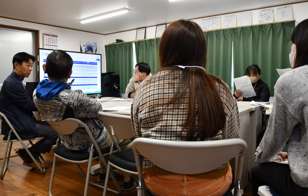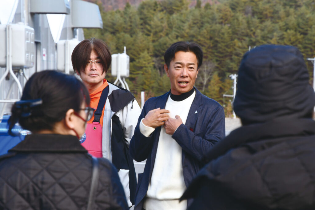 出迎えてくれたのは、代表取締役社長の松延紀至(まつのぶ のりゆき)さんと、養殖の現場を担当する大藪智樹(おおやぶ ともき)さんです。一行は2班に分かれ、1班は松延社長からHANERU葛尾の事業の説明を、もう1班は大藪さんから養殖の現場について話を聞きました。