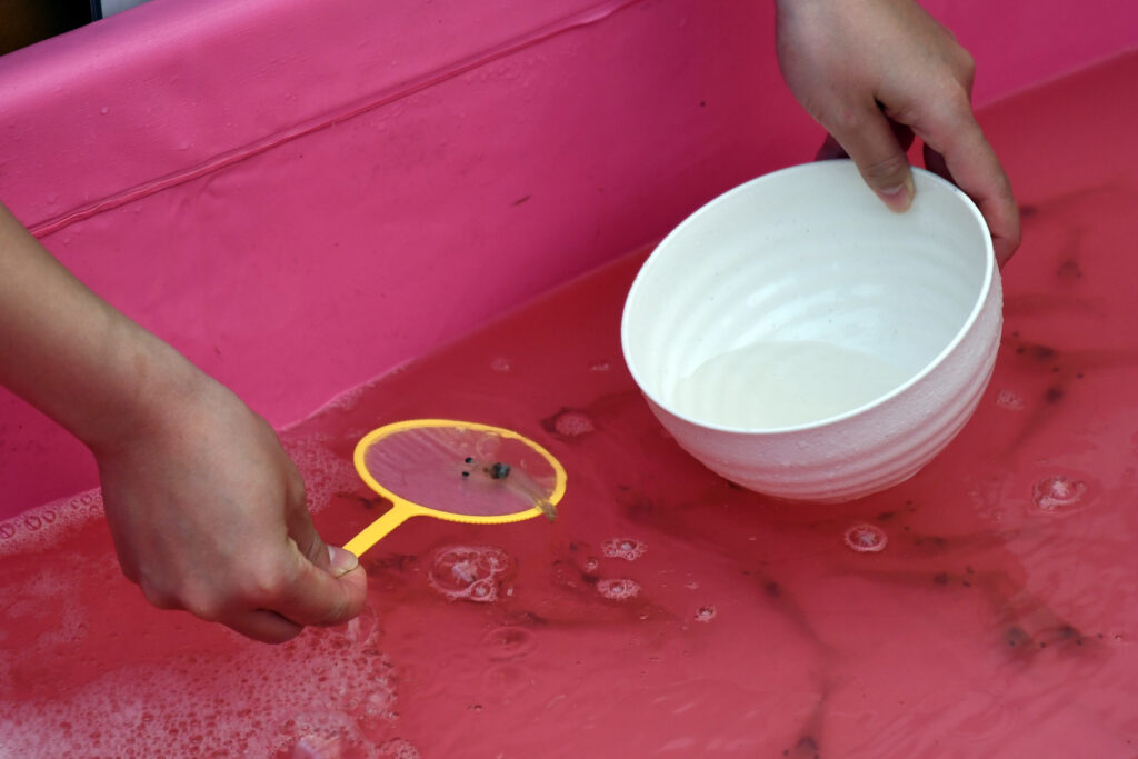 一方、大藪さんの案内で施設のなかへ入った参加者たちは、バナメイエビの成長の過程を見学しました。大きな水槽のなかでエビが元気に泳ぐ姿を見たあと、金魚すくいならぬエビすくいにチャレンジ。それぞれ童心に返り楽しいひとときを過ごしました。大藪さんからは、社員のほとんどが県外からの移住者であることや、車で30分ほど足を伸ばせば隣の田村市中心部に商業施設がまとまっており、生活に必要な買い物がそろうこと、仕事のやりがいなどの話を聞きました。