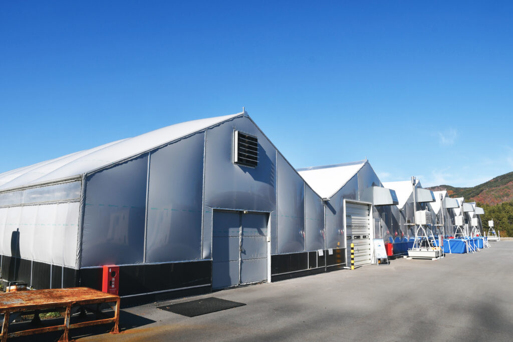 続いて参加者は、村を見下ろす高台に造成された葛尾村産業団地へ。ここには、エビの陸上養殖に取り組む株式会社HANERU葛尾が拠点を構えています。純白の大きなハウスのなかに水槽を設置した国内最大級の陸上エビ養殖場で、身が柔らかく強い甘みが特徴のバナメイエビを養殖しています。