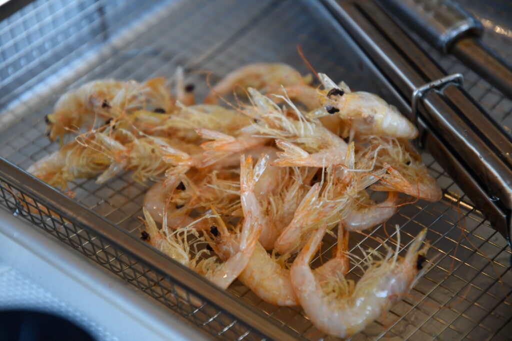 するとそこに、HANERU葛尾の松延社長が大きな発泡スチロールの箱を抱えてやってきました。箱のなかにはエビがぎっしり。新鮮なエビをその場で素揚げにして参加者に振る舞ってくれました。村に生まれた新しい特産の味に参加者全員大満足の昼食となりました。