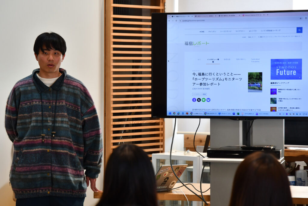 続いて登壇したのは、阪本健吾さん。兵庫県西宮市出身で、広島県の大学を卒業後に旅行会社に就職。島根県内で勤務したのち、2022年に葛尾村に移住しました。福島との最初のつながりは、大学時代に震災・原発事故の被災地域をフィールドとしたスタディツアー「ホープツーリズム」に参加したこと。コロナ禍で旅行の需要が減った時期に福島での経験を思い出し、葛尾村への移住を決意しました。