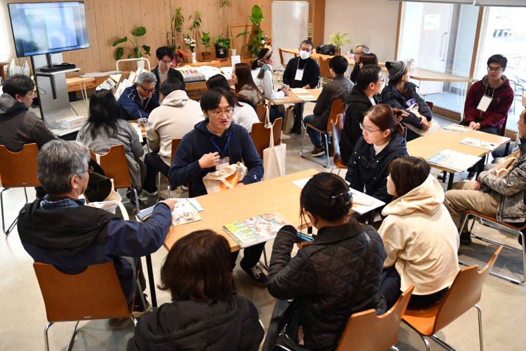 それぞれのお話を聞き終わったあとは、参加者が4つのテーブルに分かれ、菊池さん、「こんにちは かつらお」の移住相談員、ふくしま12市町村移住支援センターの職員が各テーブルをまわって、葛尾村での暮らしや移住の心得などについてディスカッションする時間が設けられ、和やかで活発なやりとりがおこなわれました。